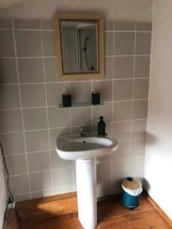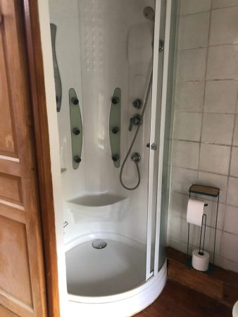 La salle de bain privée est attenante avec une douche, un lavabo et des toilettes.